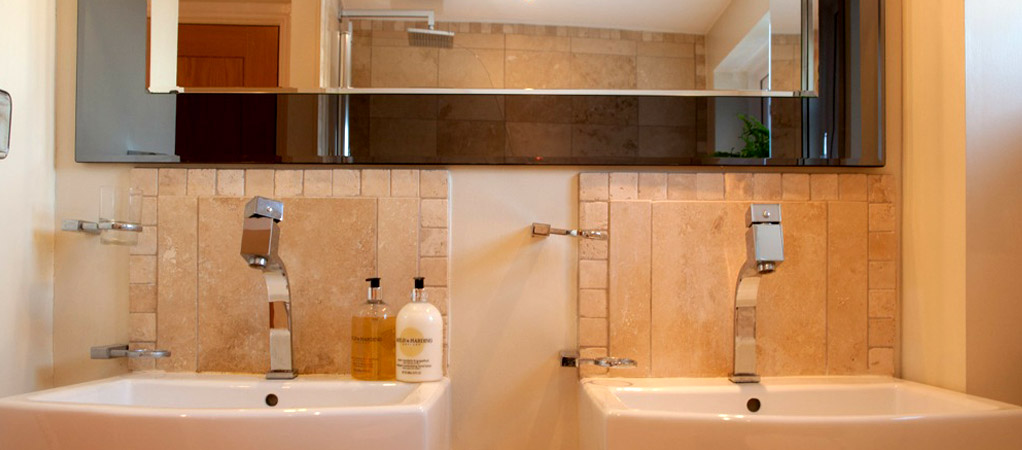 - Spacious bathroom with twin basins, shower, jacuzzi bathtub and marble tiling.